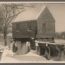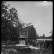 West's Mill, East Parish River, Millvale, Haverhill. Small one story wood mill building built over East Parish River. View of right and rear sides. Established by Anthony Chase of Newbury in 1757; bought in 1882 by Frank West, who operated it until 1895 when the city of Haverhill purchased the water rights and constructed the Millvale Reservoir. Thomas H. West, son of Frank, moved the old mill down to the road, operating it until the early 21st c...