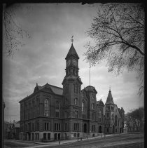 City Hall, Main Street, Haverhill. Three stories plus basement, brick, four and five story towers in center including belfry and clock. View of front. A tree branch is in the foreground on the right. Pedestrians, parked cars. Inscription on housing: "Haverhill City Hall / ca. 1940-1955." This may be a later contact print. This version of the building stood from 1889-1973. Full call number is HH12.2.3 Senter HPH 16-216M.
