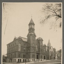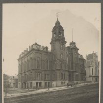 City Hall, Main Street, Haverhill. Three stories plus basement, brick, four and five story towers in center including belfry and clock. View of front and left sides. Court Street on the left, First Pentecostal Church of the Nazarene on the right. Trolley tracks in the street. This version of the building stood from 1889-1973. Inscription on verso: "Photo by Thomas Bailey / City Hall." Image late 19th or early 20th century, this is a later print. ...