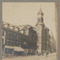 City Hall, Main Street, Haverhill. Three stories plus basement, brick, four and five story towers in center including belfry and clock. View of front and left sides, showing street incline. Wesley Methodist Church on the right. A horse and carriage are on the street in front of the building. Trolley tracks in the street. Emulsion damaged. Original image late 19th century before the November 1888 fire; this building stood from 1861-1888. Photo by ...