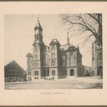 City Hall, Main Street, Haverhill. Three stories plus basement, brick, four and five story towers in center including belfry and clock. View of front and right sides, showing street incline. Horses and carriages in the street. Church of the Nazarene partly visible on the right, sign "Furniture Ware House" on building on the right. From "Art Work of Essex County," published 1896 by W. H. Parish Publishing Company. Print is 26 x 31 cm mounted on ca...