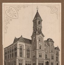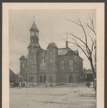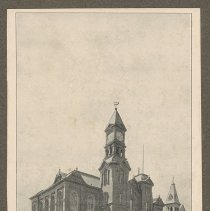 City Hall, Main Street, Haverhill. Three stories plus basement, brick, four and five story towers in center including belfry and clock. This version of the building stood from 1889-1973. View of front and right sides. Printed caption: "City Hall, Haverhill, Mass." Photomechanical print of a photograph from an unidentified publication. Print is 15 x 13 cm mounted on cardboard 23 x 18 cm. Housed with Historical Photographic Print Collection.