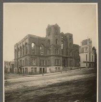 City Hall, Main Street, Haverhill. View of front and left sides. The building was destroyed by a fire in November 1888; smoke still lingering from the smoldering building. This view from across the street shows the building without the roof and interior walls. The building was three stories plus basement, brick, four and five story towers in center including belfry and clock (missing). This building was erected in 1861; image taken after the fire...