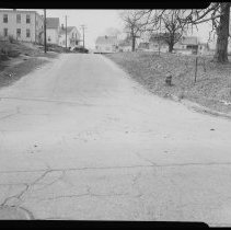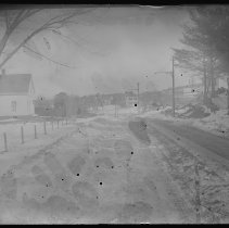 Amesbury Road, looking east toward Job's Hill, Haverhill. Houses on both sides. Snow on the ground. Trolley tracks in the street. Emulsion damaged. Label on emulsion: "Smith #1 Amesbury Rd." Image probably early 20th century.