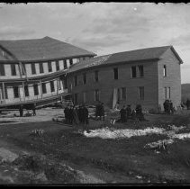 The Buena Vista Hotel, Ward Hill, Bradford, Haverhill, after a tornado, April 3, 1891. Large main building on the left, smaller building on the right. Men in front; they are wearing coats and hats. Snow on the ground. Typed below photo: "Hotel at Heads Hill, Wreck." Inscription on verso: "Nick / Wreck of Hotel / on Head's Hill / Bradford - April 1891." Photo by Austin P. Nichols. See glass negative HF3 Senter G6x8 1-3, print HF3 Senter HPH 33-457...