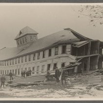 The Buena Vista Hotel, Ward Hill, Bradford, Haverhill, after a tornado, April 3, 1891. Large main building, clapboard, two stories, gable roof with cupola; the right end without a wall. Men in the foreground in groups; they are wearing coats and hats. Snow on the ground. Photo by Austin P. Nichols. Lantern slide: see HF3 Senter GLS 7-36, prints HF3 Senter HPH 33-457D, 34-463C.